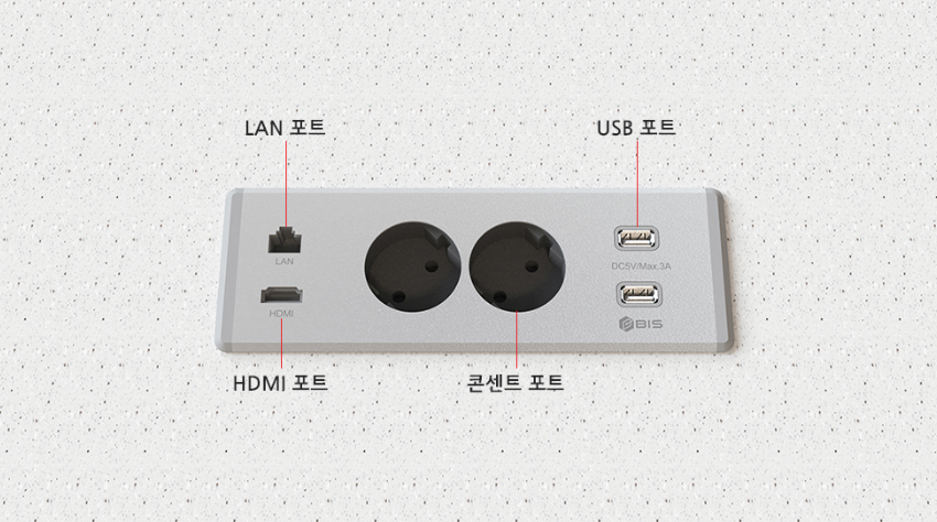 - 콘센트와 USB A타입을 기본으로 하며, LAN과 HDMI 포트를 원하는 구성으로 선택하여 제품 구매 가능 ('관련 상품' 참조)