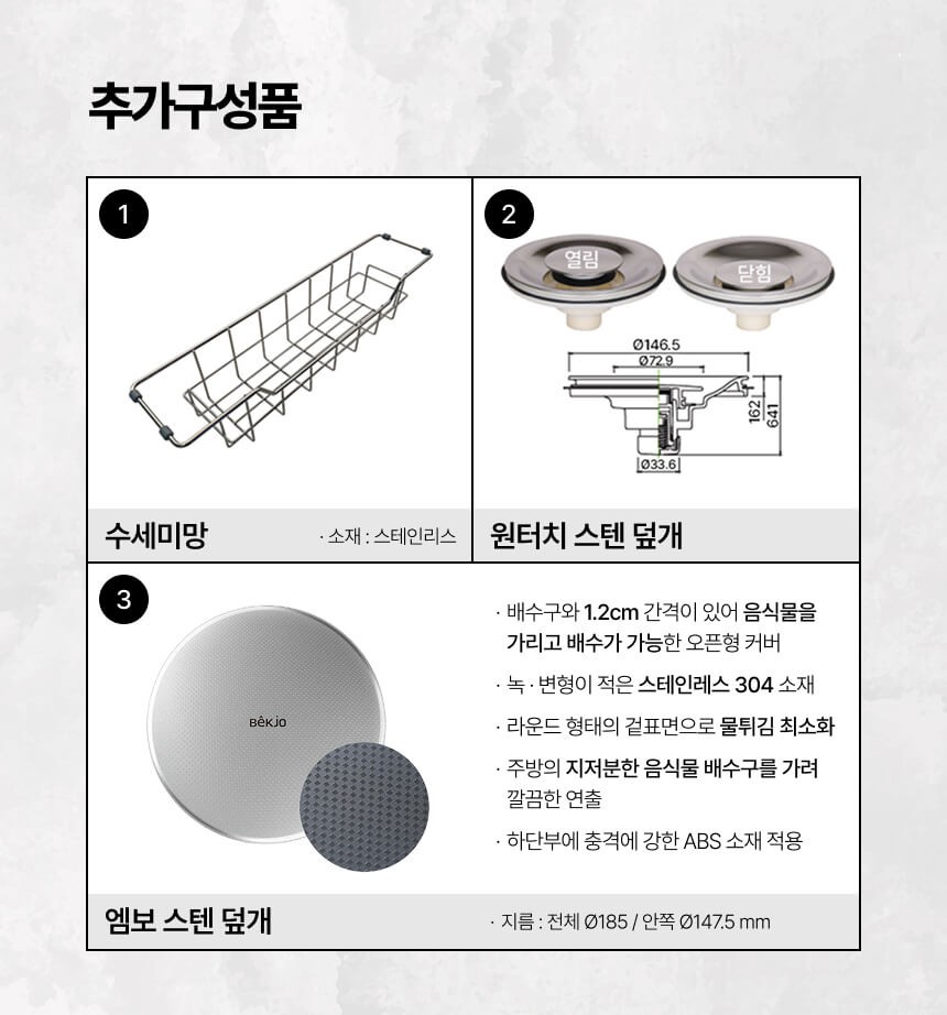 | 구성품 | 싱크볼, 와이어 바스켓, 미송 도마, 배수구 | ||