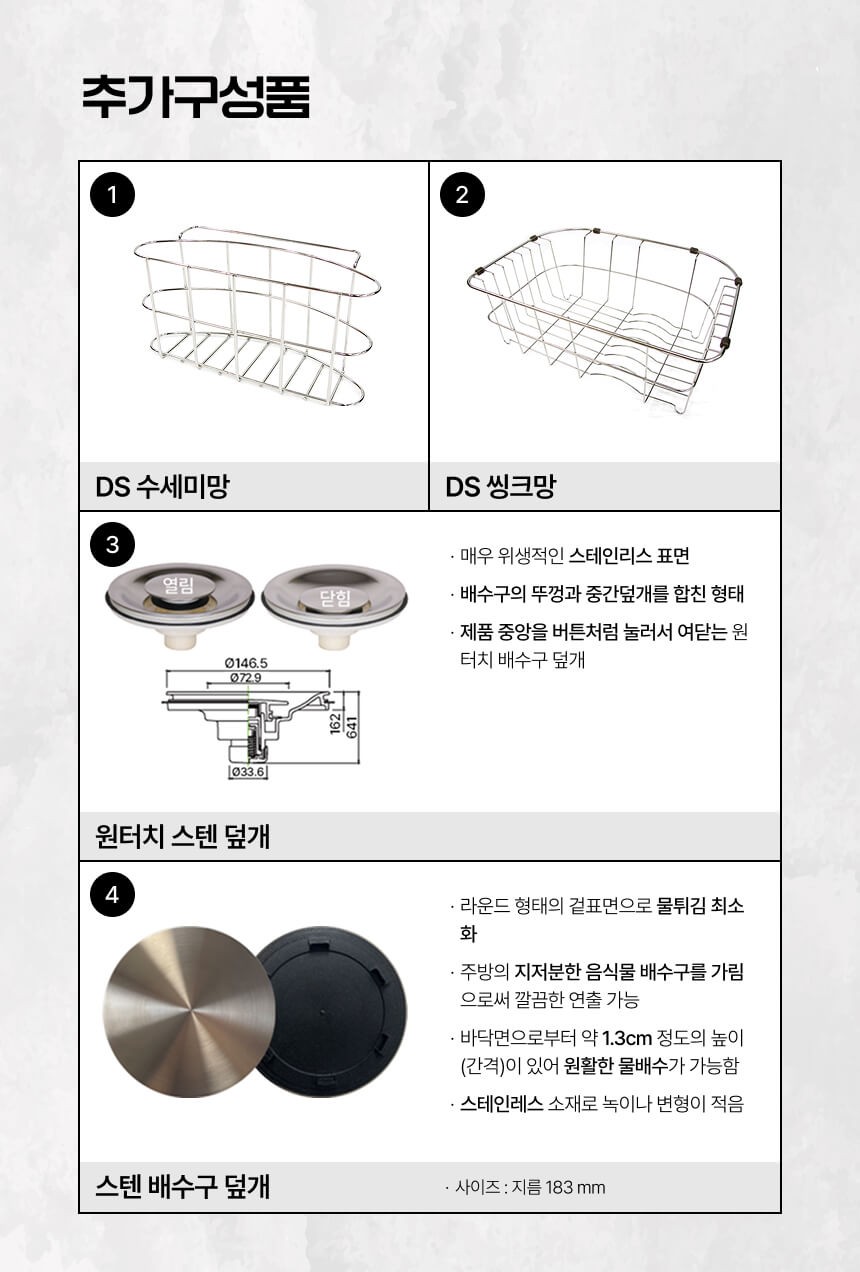 백조씽크 DS740 언더 싱크볼 배수구 포함 740DS 닫기 확대보기 판매가70,000원 배송비 상품 수령 후 지불 브랜드백조씽크(BekJo Sink) 제품선택 선택해주세요 0.6T 0.7T 추가구성 악세사리 추가 구성 - 선택해주세요 악세사리 추가 구성 - DS 수세미망 (7,000원) 악세사리 추가 구성 - DS 씽크망 (9,000원) 악세사리 추가 구성 - 스테인레스 배수구 덮개 (12,000원) 추가구성 배수구 교체 - 선택해주세요 배수구 교체 - 클린 스테인레스 배수구(원터치 스텐 덮개 포함) (32,000원) 배수구 교체 - 엔지 클린 스테인레스 배수구 (38,000원) 배수구 교체 - 엔지 올스텐 배수구 (50,000원) 삭제 -감소 +증가 0원 삭제 -감소 +증가 0원 결제금액70,000원 장바구니 보관함 비회원구매 구매하기 닫기 ( 1 / 3 ) 원래 크기의 사진 이미지입니다.두 손가락을 펼치면 사진이 커지고오무리면 작아집니다. 이전 다음 이전 다음 상품 설명 쇼핑몰 공지사항 상품 후기/문의 상품 설명 모델명 백조씽크(Baekjosink) DS740 설치타입 언더 재질 스테인레스 스틸 304 두께 0.6T / 0.7T 볼전체 사이즈 W 740 × D 515 × H 190 mm 볼내경 사이즈 W 660 × D 435 mm 타공 사이즈 W 712 × D 487 × R106 mm 배수구 사이즈 Ø162 (JS 대배수구타입) 기본 구성품 씽크볼, 기본 배수구 상품 설명 쇼핑몰 공지사항 상품 후기/문의 쇼핑몰 공지사항 상품 설명 쇼핑몰 공지사항 상품 후기/문의 상품 후기 1 5점 중 3점 2013-01-01 작성자작성일 답변 상품 후기가 없습니다. 더보기 상품 문의 1 김미 2013-01-01 Question 수정 | 삭제 문의내용 Answer 작성자작성일 답변 상품 문의가 없습니다. 더보기 문의하기 상품 문의 문의 내역 등록 닫기 공유하기 페이스북 네이버 메일 주소복사 좋아요0
