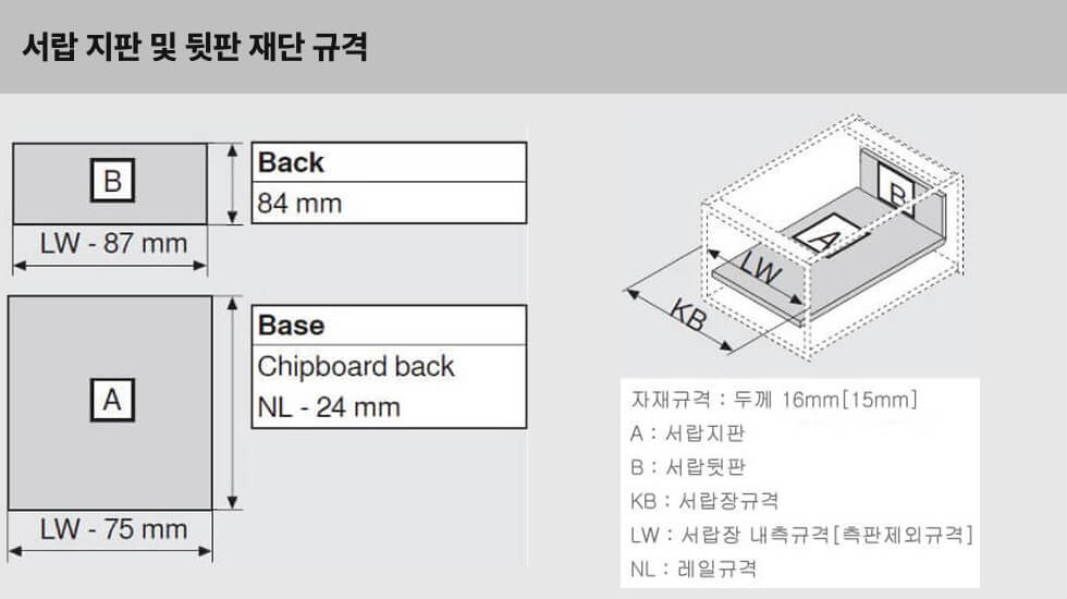 | 서랍 내통의 지판 & 뒷판 자재 두께 | 16 mm(15 mm) |