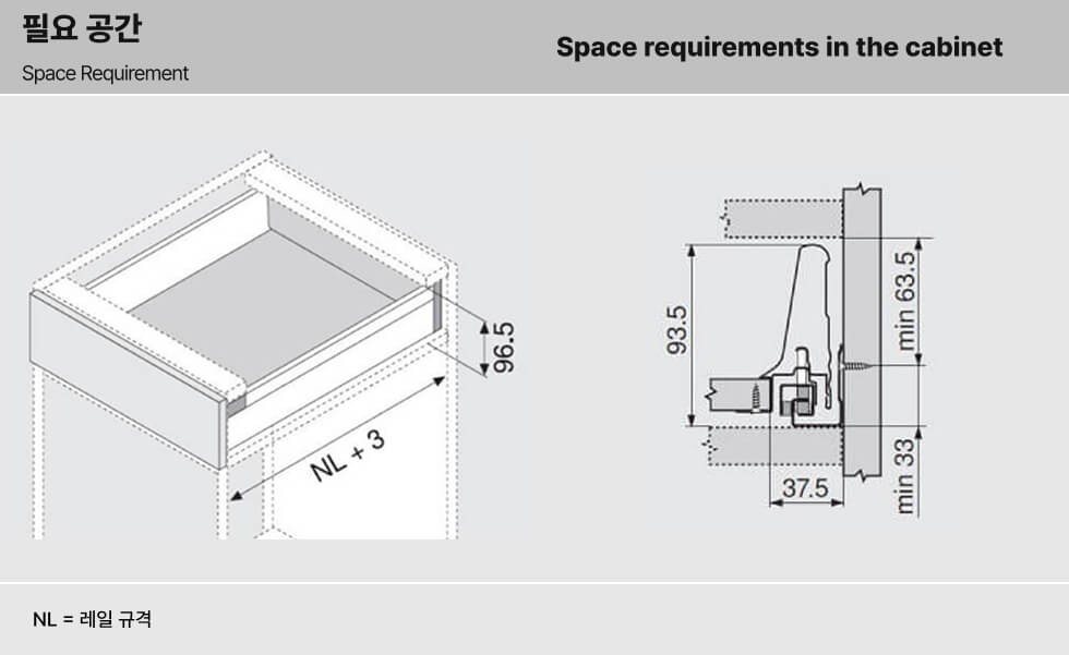| 서랍 내부 높이 | 최소 96.5mm 이상 확보 필요 |