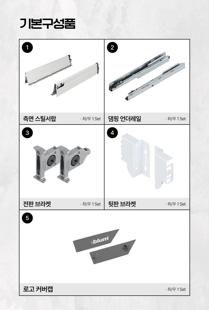 | 구성품 | 측면 스틸서랍 1조, 댐핑 언더레일 1조, 전판 브라켓 1조, 뒷판 브라켓 1조, 로고 커버캡 1조 |