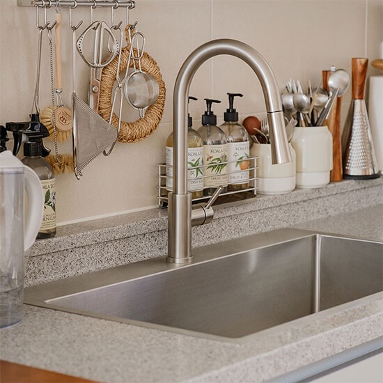 - 기본으로 중앙 수전 타공이 되어 출고되며, 좌측/우측에 쉽게 직접 추가타공 가능 (기본타공은 별매 수전마개로 막아서 사용)