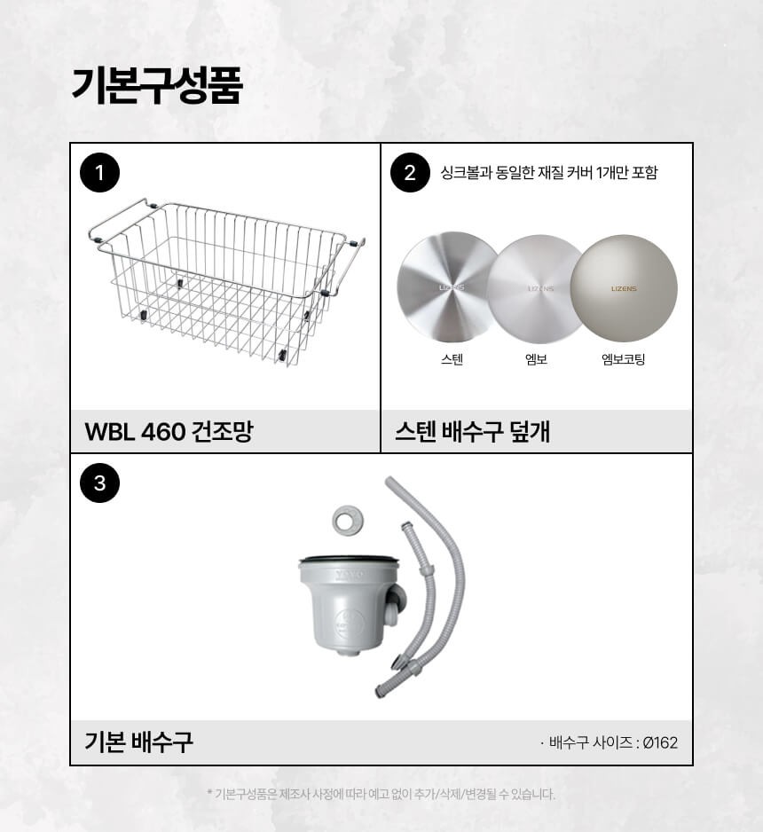| 기본 구성품 | 싱크볼, WBL 460 건조망, 스텐 배수구 덮개, 기본 배수구 |