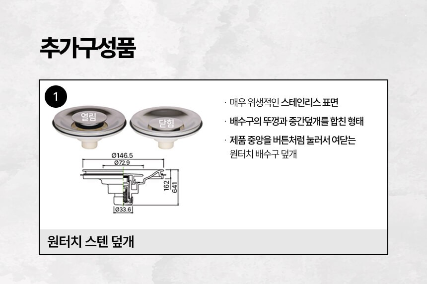 - 스텐 배수구 커버는 싱크볼 재질과 동일한 재질의 덮개 1종만 포함입니다.