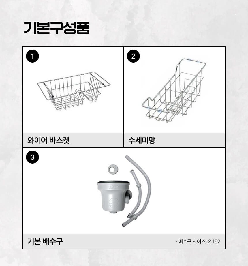 싱크볼 본품, 와이어 바스켓, 수세미망, 기본 배수구 * 상단 이미지의 배수구 덮개는 미포함입니다. |