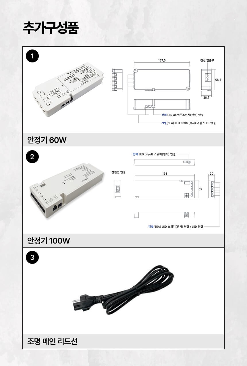 - 안정기와 조명 메인 리드선은 해당 페이지의 추가 구성에서 구매 가능하며 스위치의 경우 해당 홈페이지 동일 카테고리 내에서 선택 후 구매 가능 합니다.