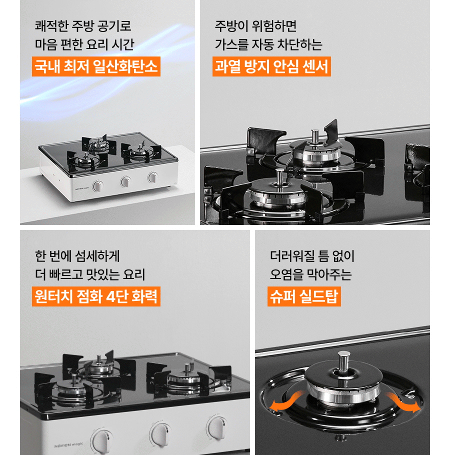 전화구 과열방지 안심센서, 에코 버너 기술(국내 최저 일산화탄소), 슈퍼 실드탑, 완전 분리형 버너 |