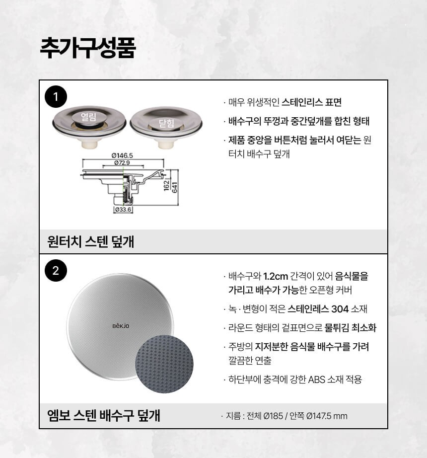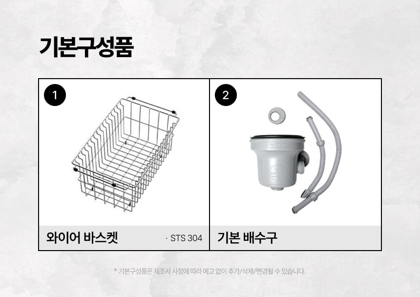 기본 구성품 싱크볼, 기본 배수구, STS 304 와이어 바스켓