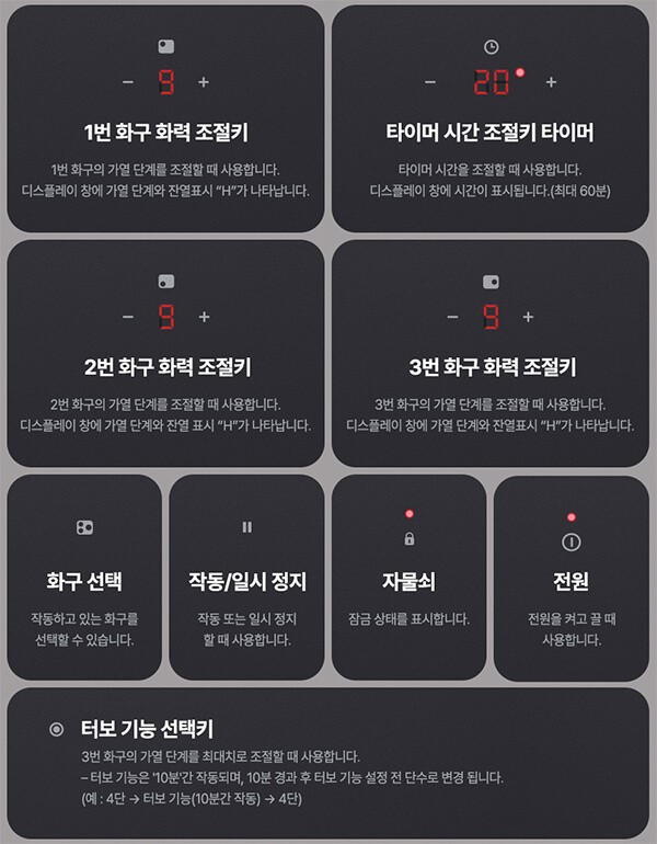 기능 쿠킹 존(쿡탑연동), 터보 부스터, 스마트 전력제어, 잔열표시, 자동꺼짐, 잠금, 타이머 등